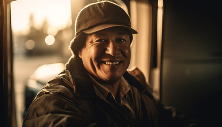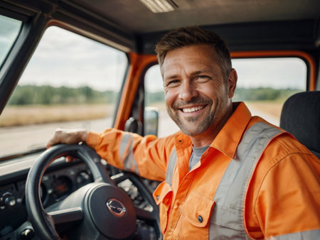 A cheerful driver sits in the cab of a truck, enjoying the open road and the freedom that comes with it. AI Generative AI