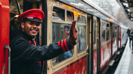 Train conductor signaling departure, red cap, blurred background. ai generated