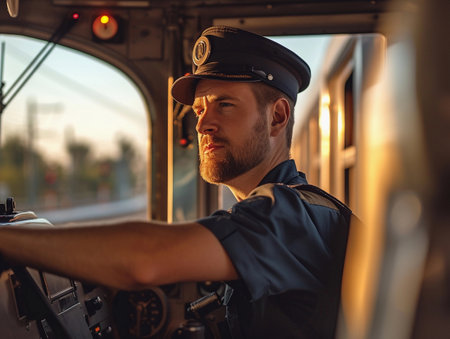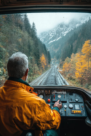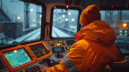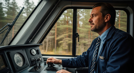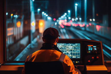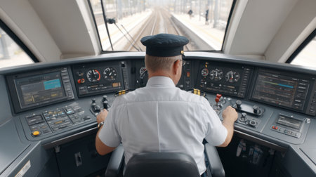 A dedicated train engineer operates a high-speed train from a well-equipped control room, emphasizing the importance of precision, safety, and modern engineering in transit.