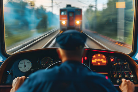 A dedicated train operator is seen from behind in the control cabin, focusing on the dashboard instruments while navigating the railway tracks with precision and skill.