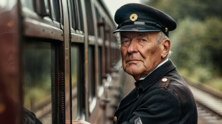 A charming train conductor stands ready to take passengers on a journey through the peaceful countryside