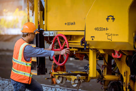 Engineer railway under checking construction process train testing and checking railway work on railroad station with radio communication .Engineer wearing safety uniform and safety helmet in work.