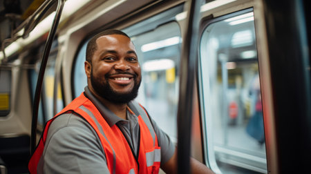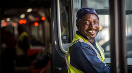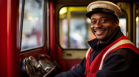 Portrait of a cheerful African American truck driver smiling warmly while seated in his vehicle, wearing a cap and work attire.