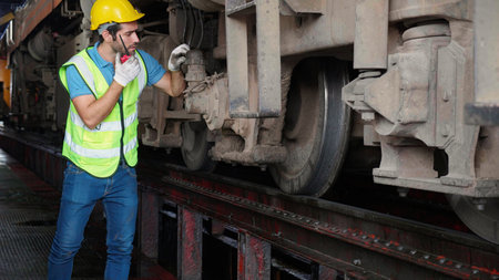 Young caucasian engineer man maintenance and repair train diesel engine while using talkie with command to worker in station, engineer inspect system transport, transportation and industry.