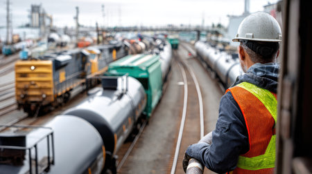 A worker in a safety vest and helmet watches freight trains in an industrial yard, highlighting transportation and logistics operations with cargo tanks and equipment.