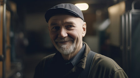 A smiling senior Swedish male factory worker standing in metal sheet factory. Generative AI AIG19.