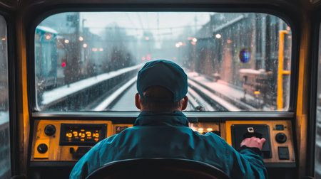 Back view of train driver operating locomotive through snowy urban landscape, showcasing transportation industry and winter weather challenges.
