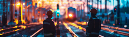 Railway workers observing a passing train during twilight with warm and blue highlights