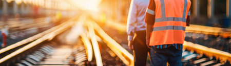 Inspector Engineering wearing helmet and vest worker unifrom checking railway construction work on rail track.