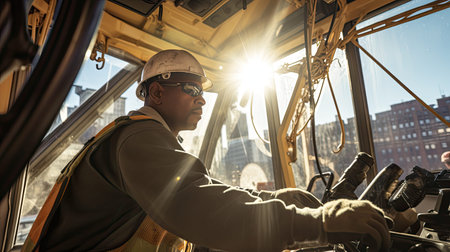 Inside view of a locomotive driven by the driver of an old shunting freight train, Generative AI.