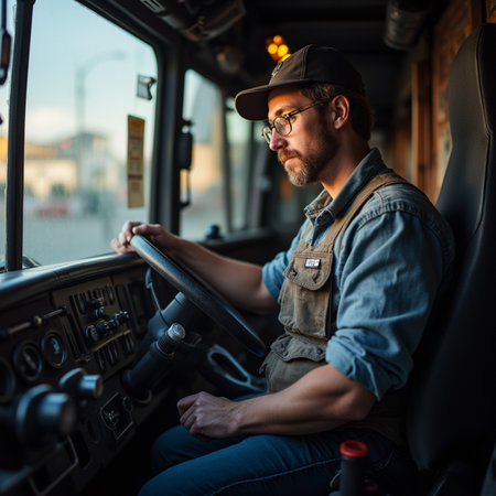 A thoughtful truck driver looks out from his cab, gazing at the road ahead, captured in a moment of quiet contemplation.