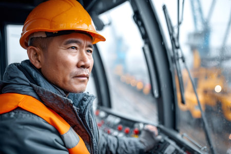 Asian dock worker wearing safety hardhat and vest operating crane machinery in rainy port