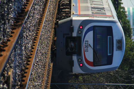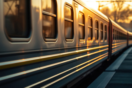 Train in motion. Fast, dynamic, travel. Speed, transportation, railway, movement, close up.
