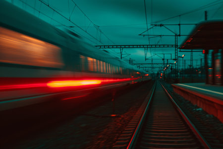 A dramatic evening shot capturing a moving train with dynamic light trails, conveying motion and the passage of time