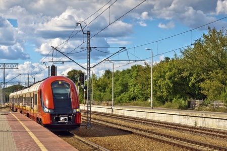 A modern high-speed red train on a section of the Moscow Central Circle Line.