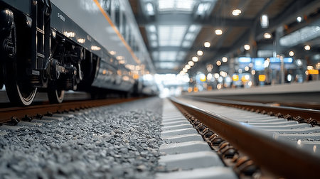 Detailed shot of a railway platform with tracks in view, showing the interaction between the platform and the rails, and the surrounding environment.
