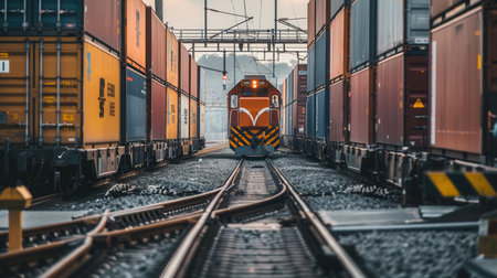Colorful train containers are lined up along railway, showcasing vibrant array of hues including pink, orange, and blue. This striking visual captures essence of transportation and logistics.
