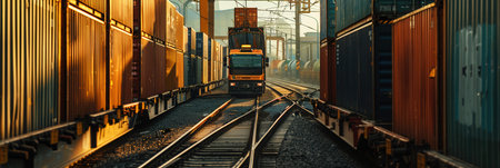 Freight trains loaded with containers aligned on tracks at a railway yard as the sun sets, creating a warm glow over the landscape. The scene highlights the connection of global trade networks.