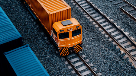 A detailed overhead shot of a bright orange toy train, complete with a matching cargo container, navigating a miniature railway system.