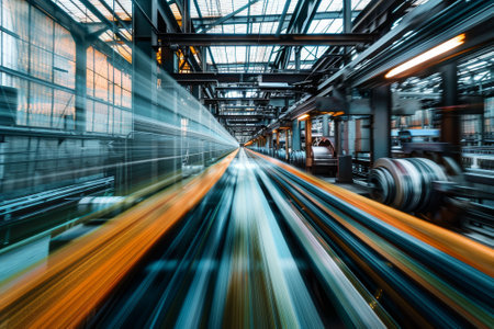 Close-up perspective of industrial railway tracks inside a spacious warehouse, emphasizing rust and metal details. An intriguing view showcasing urban infrastructure.