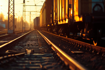 Railroad tracks stretch towards a bright sunset, with focus on the gravel stones. The composition features a low-angle perspective, emphasizing the tracks' linear design against a blurred background. The overall style suggests a sense of depth and evokes feelings of travel and journey. The image can be used for various commercial or editorial applications.