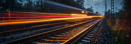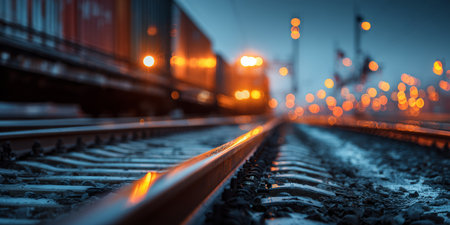 Sunset illuminates a railway station with vibrant colors and dynamic train tracks in motion