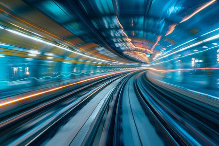 A train speeds along a winding underground track, showcasing a mesmerizing blur of lights and colors. The vibrant blue ambiance combined with the motion creates a captivating atmosphere.