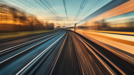 A striking image capturing the motion of a train as it curves along the tracks at sunset, showcasing vibrant colors and dynamic perspective, symbolizing speed and travel.