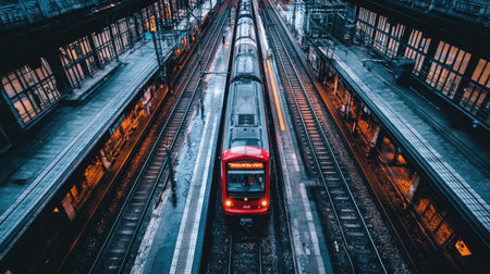 An overhead view of a busy train station with trains arriving and departing on multiple tracks, capturing the hustle and bustle of daily commuter life.