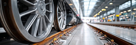 Close-Up of Vintage Train Locomotive Wheels and Shiny Railway Tracks at a Modern Station Setting.