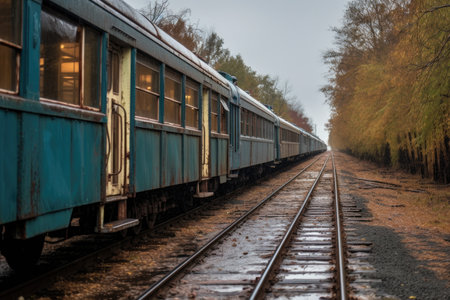An old passenger train emerges from a curve on a rustic railway, its path illuminated by the warm, golden light of a setting sun. The journey through the quiet autumn forest evokes a sense of nostalgia and peaceful adventure, a timeless passage through a beautiful, natural landscape.