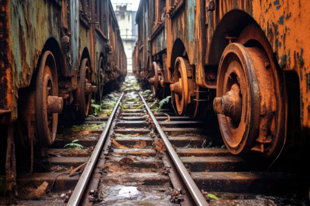 Quiet industrial rail siding, multiple empty cargo wagons, overcast sky,