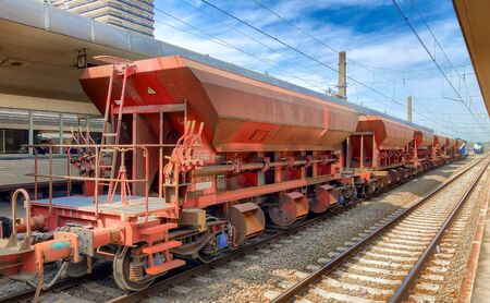 The red carriages of the railway train ride on the rails. Transportation of goods by trains