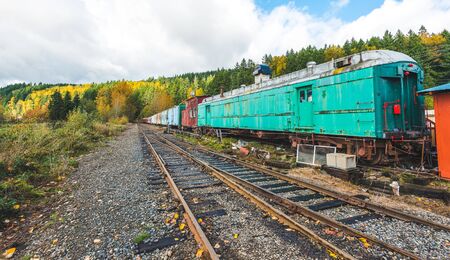 Railroad and colorful train in autumn season,mt Rainier National park area,Elbe,Washington,USA..