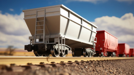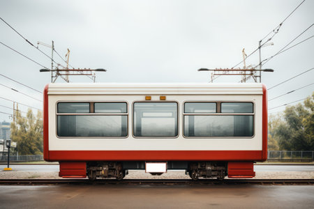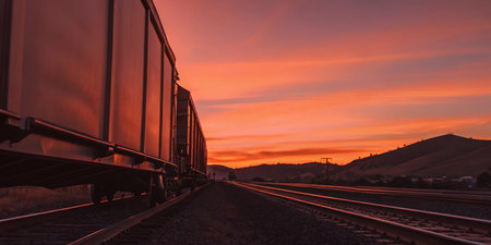 train passing by on railroad tracks at sunset, featuring a light gray and red color scheme. this photo captures the essence of working-class empathy with its streamlined forms, metallic finishes, and soft-focus portraits. the innovative techniques used create a serene atmosphere, enhancing the overall aesthetic appeal. ai generated