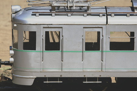 Photo of a train that travels by rail against a background of green grass. Wheels, rails and sleepers.