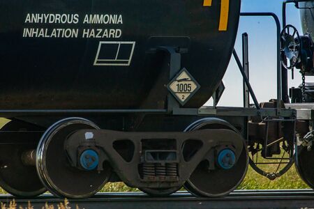 Close up of the tank car of a canadian freight train with 1005 warning sign. Sign indicates transportation of toxic liquid with inhalation hazard.