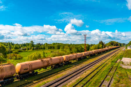 The freight train passes by the station. Set of train tanks with fuel.