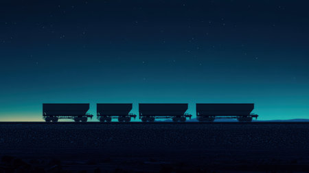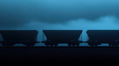 Silhouetted coal wagons moving on a dark blue gradient digital background, ideal for themes of industrial automation and energy logistics