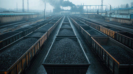 Black coal wagons in a train depot waiting for transport to a distant power station, hazy industrial atmosphere.