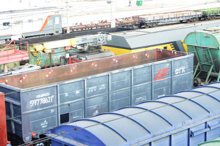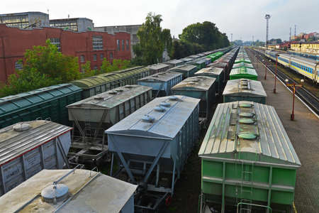 Freight railway cars at the marshalling yard.