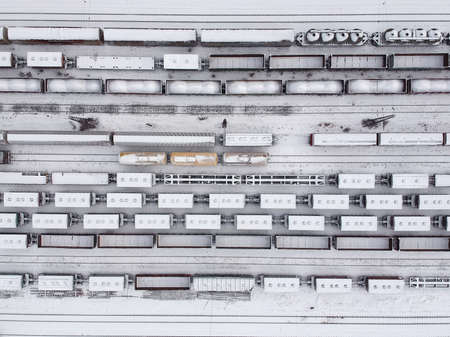 Aerial view of a cargo trains in witer. Freight trains covered with snow on the railway station. Heavy industry. No people.