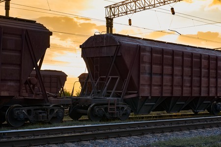Railcar for dry cargo during beautiful sunset and colorful sky, railroad infrastructure, transportation and industrial concept