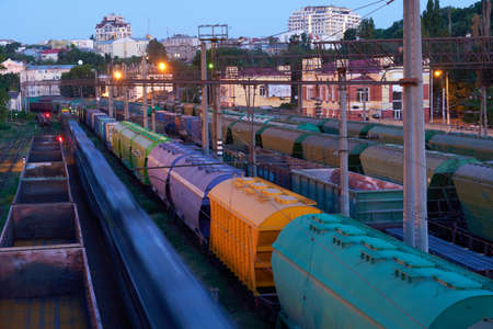 The freight train passes by the station. Wagons with goods delivery.