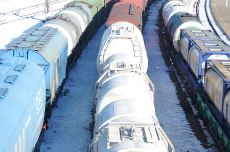 Tanks with fuel, wagons with cargo at a freight railway station. Logistics and transportation concept.
