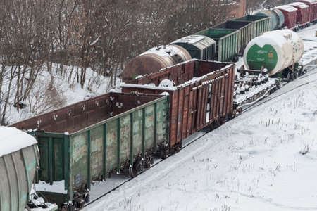 Freight cars and tanks covered with snow stand at the railway station. View from above. The concept of railroad transportation. Krasnodar, Russia, February 18, 2021