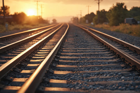 Railroad tracks stretching into the distance at sunset, with golden light reflecting off the rails, creating a peaceful atmosphere.