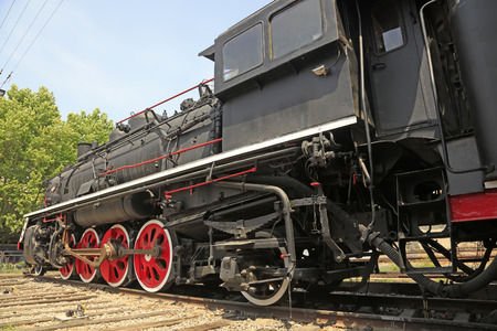 Train drive mechanism and red wheels of an old soviet steam locomotive
