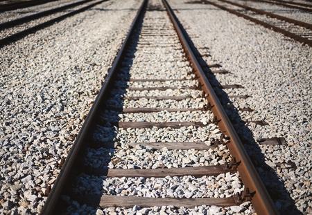 rusty metal railway tracks and brackets in a ballast bed, diagonal, vintage toned, selected focus, narrow depth of field