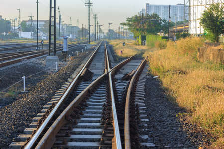 railway track, line crossing railway track on the stone background Bangkok Thailand